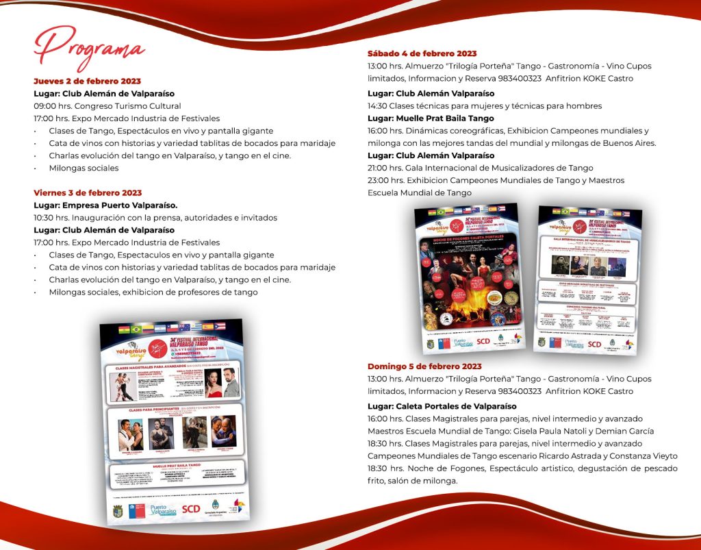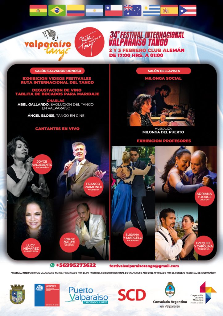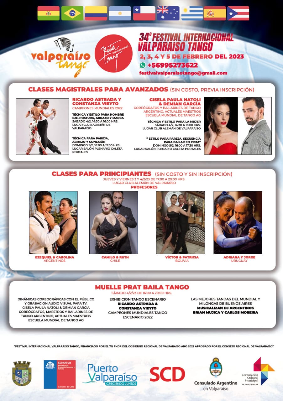 34° Festival Internacional «Valparaiso Tango» Se viene 2, 3, 4 y 5 febrero 2023Clases Magistrales con los Campeones Mundiales y Maestros de la Escuela Mundial de Tango.